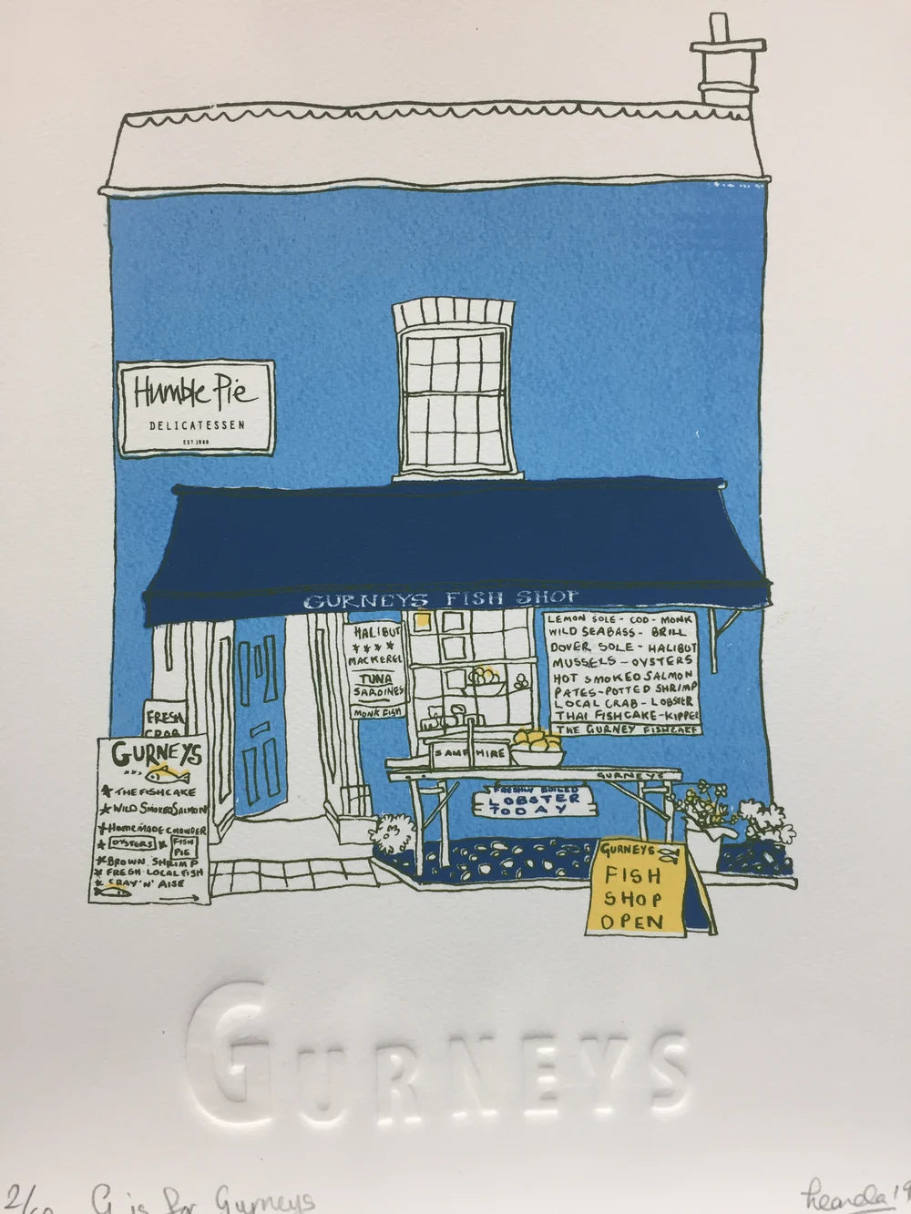 A print of Gurneys Fish Shop, a lovely fish shop and deli located in the heart of Burnham Market. They have beautifully fresh and outstanding produce. Originally printed as part of the 'A to Z of Norfolk' Collection.