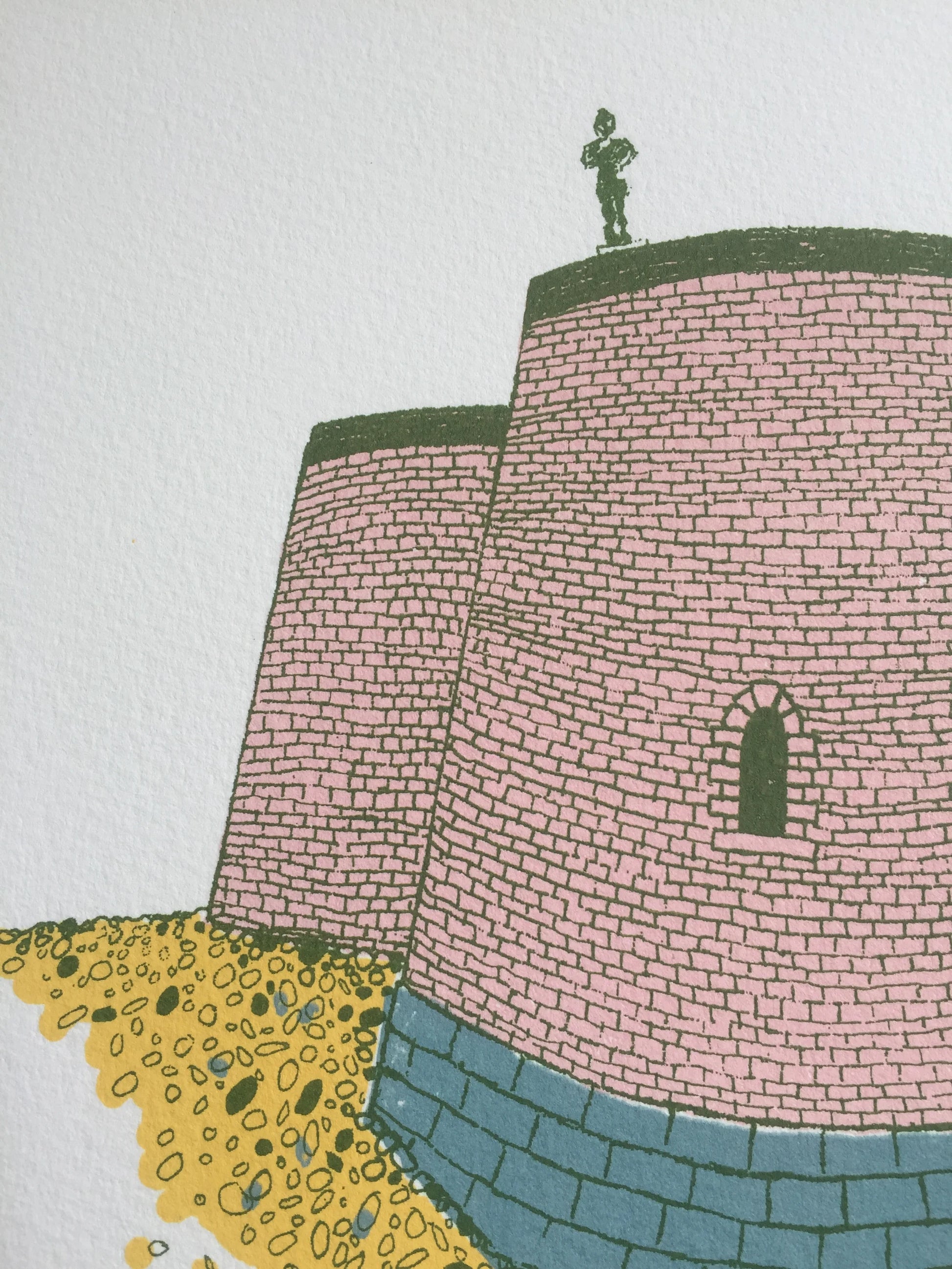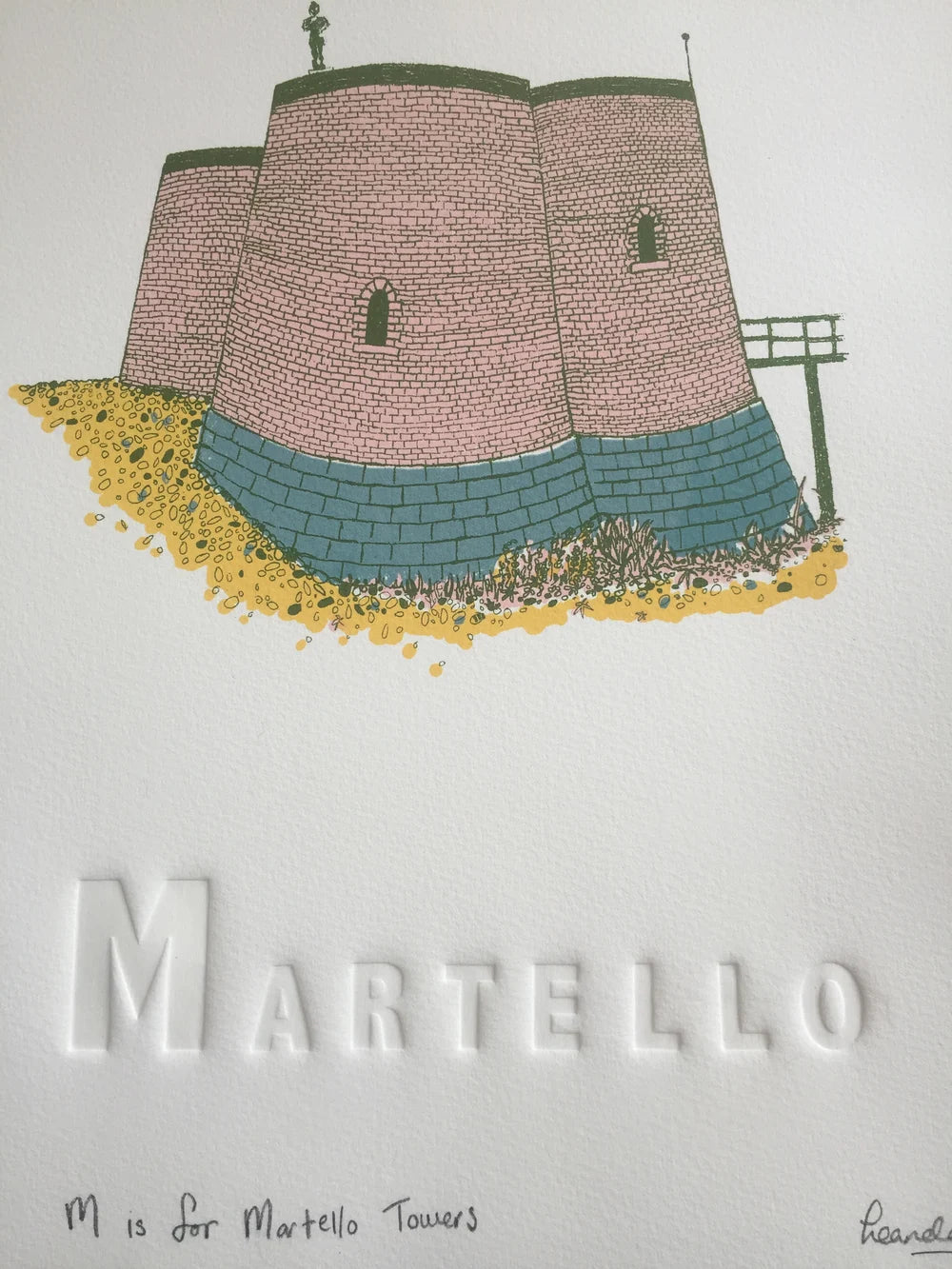 A print of the Martello Tower situated in Aldeburgh. This was drawn when Anthony Gormley had placed one of his life size statues atop gazing out to sea, celebrating 50 years of the landmark trust. Originally printed as part of the 'A to Z of Suffolk' Collection.